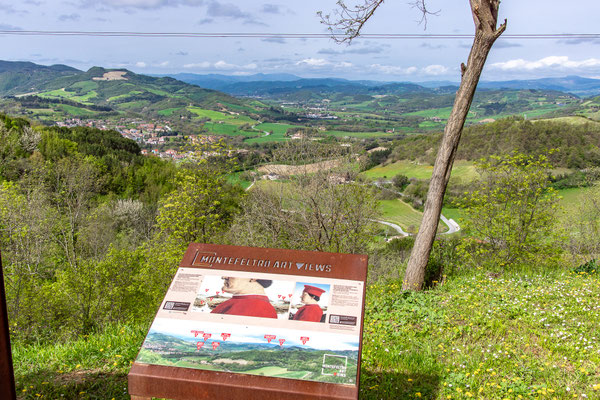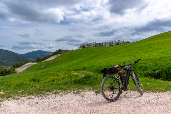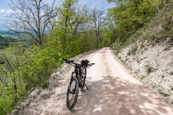 Segmento quasi interamente sterrato, su strade che salgono ripidamente di circa 300 metri in mezzo a boschi e gli splendidi panorami coillinari delle Marche per poi tuffarsi veloci alla volta della Capitale del Tartufo