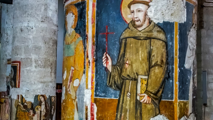 Edificata nel 1226 in segno di devozione e di riconoscenza per i miracoli chi qui si dice abbia operato, la Chiesa dedicata al frate di Assisi ospita numerosi affreschi risalenti ad un periodo compreso tra il XIV e il XVI secolo, suggestivamente anomali quelli visibili sui pilastri.