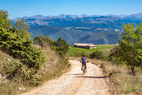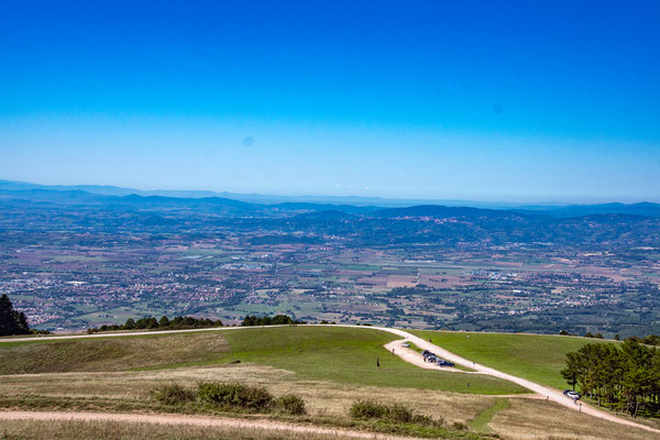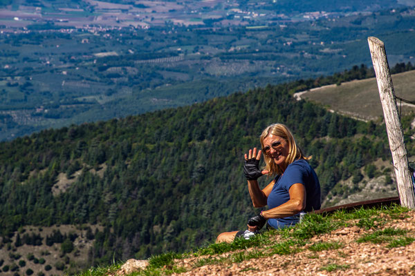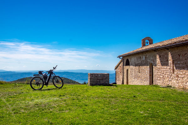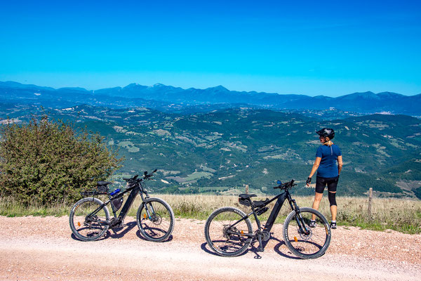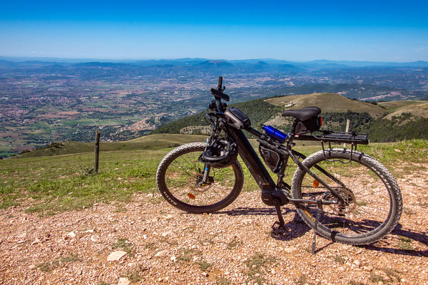 La partenza del nostro itinerario viene identificata nella parte alta del monte Subasio (per la precisione dal parcheggio degli Stazzi), evitando quella più ovvia da Assisi principalmente per due motivi: in primis per la notevole affluenza turistica che anche oggi assilla la città di san Francesco, secondariamente per non compromettere la durata delle nostre batterie (e delle nostre gambe) con una ripida, anche se mitica, salita come quella che passa dall’Eremo delle Carceri. Mitica ovviamente per chi la affronta senza elettrici ausili ;-)