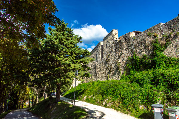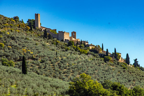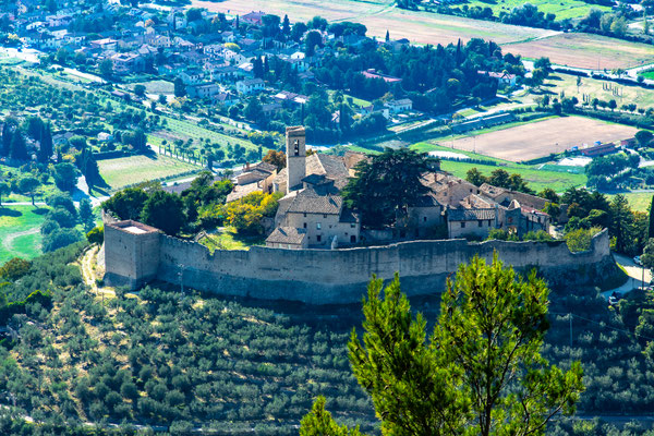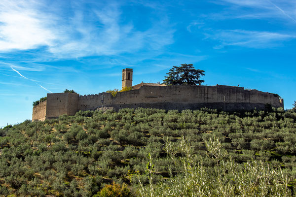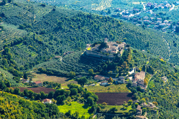 Approfittiamo della strada che dal castello risale il fianco montano, e che conduce verso il confine marchigiano, per ammirare il castello dall’alto e godere della sua millenaria bellezza; da qui lo sguardo spazia lungo la valle fino ad incontrare il seducente profilo della città di Spoleto, oggi purtroppo velato da una dispettosa foschia