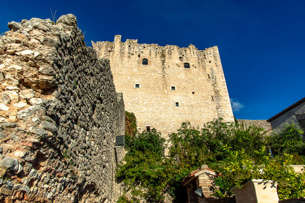 La sua maestosa sagoma, cinta da mura quadrate e impreziosita da quattro robuste torri angolari cilindriche, custodisce al proprio interno l'intero borgo antico al quale si accede dall'ingresso principale, sovrastato da un altero torrione, che reca ancora evidenti i segni del suo passato guerresco.